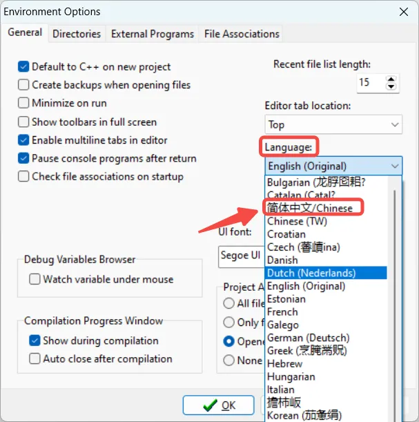 然后在Language选择第三个:简体中文,点击OK就可以啦~