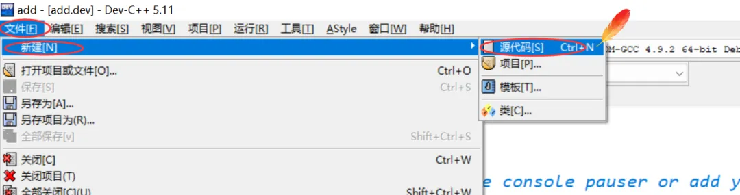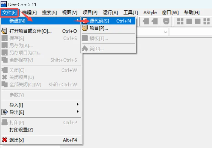 点击左上角的文件,在新建中选择源代码,就可以直接创建一个源文件。