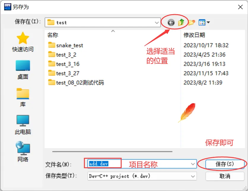 因为在DevC++下:创建的项目仅仅是存在于软件层面,而若要将写好代码的源文件运行起来,则需要将其存储到本地后才行。