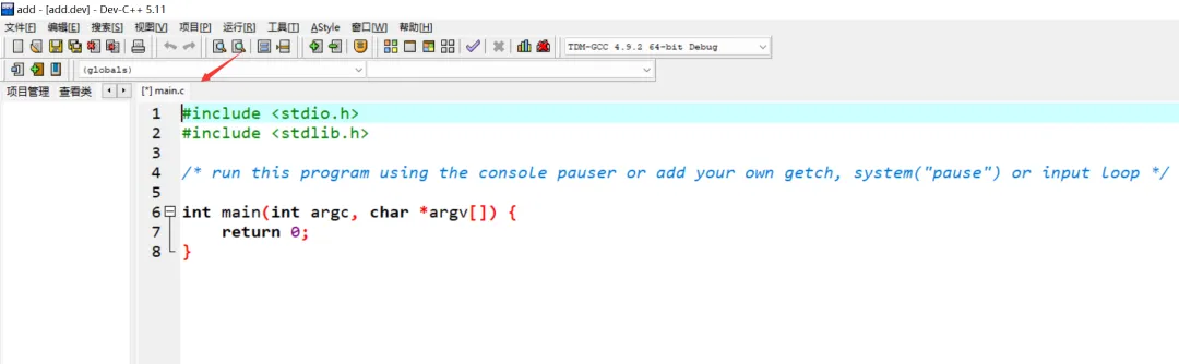 默认生成了一个名字加:main.c的文件,并且有默认的代码,文件没有保存,按ctrl+s,对代码进行保存就可以。