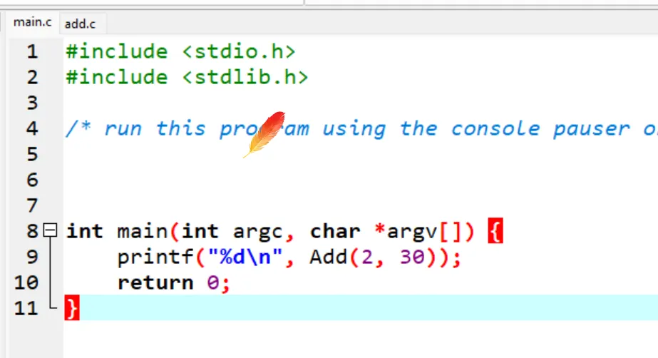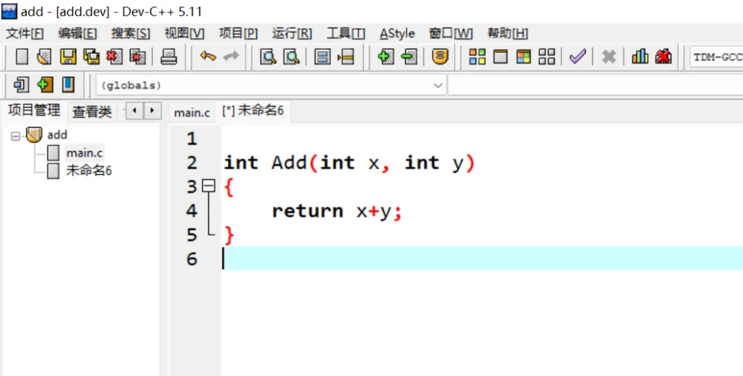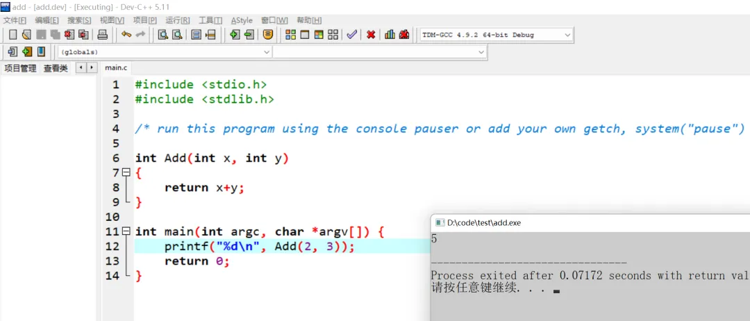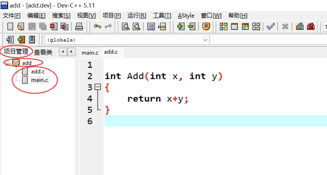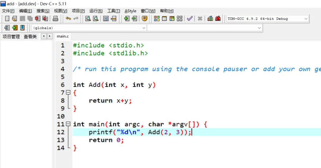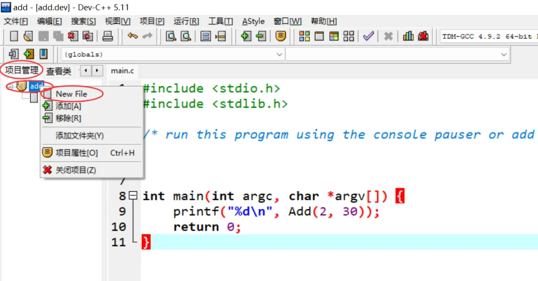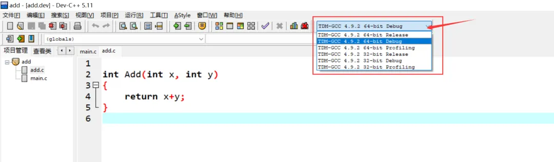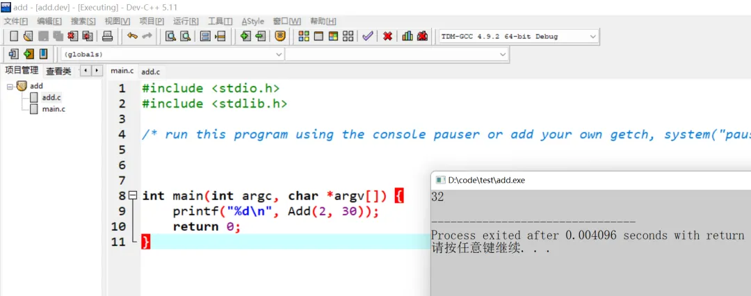 如果一个项目要有多个文件,比如在上面的项目中要增加一个新的文件add.c,将Add函数放在add.c中,对两个文件进行编译,来完成任务。