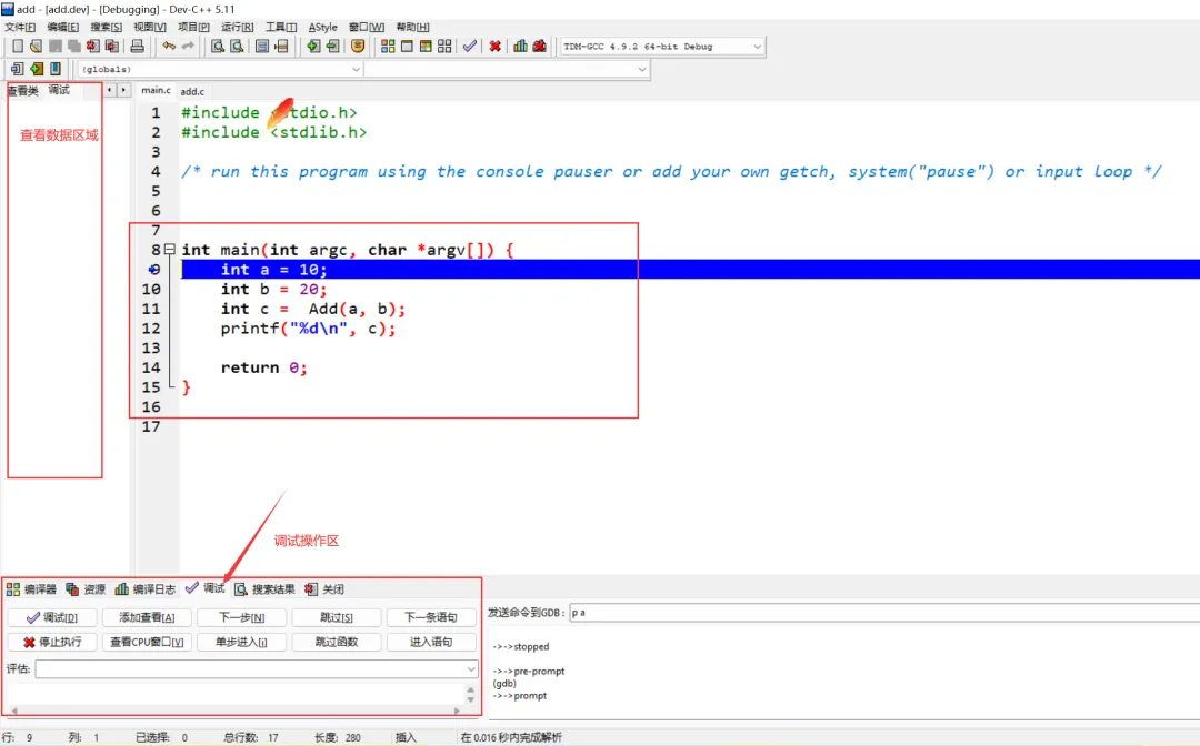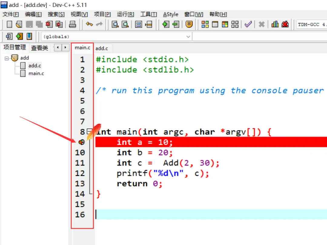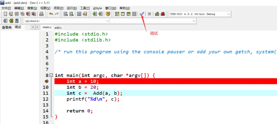 在DevC++中调试,要使用断点配合调试,先设置一个断点,代码执行到断点出才能停下来。