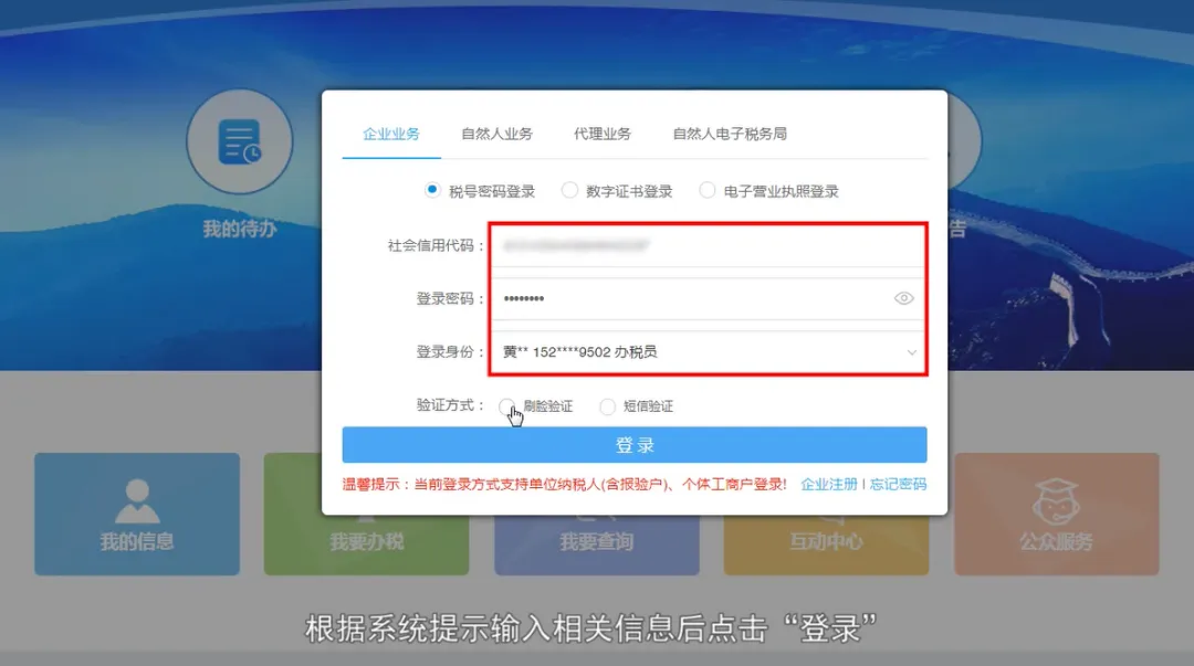 再点击“我要办税”,在弹出来的登录弹窗中根据系统提示输入相关信息后点击“登录”。