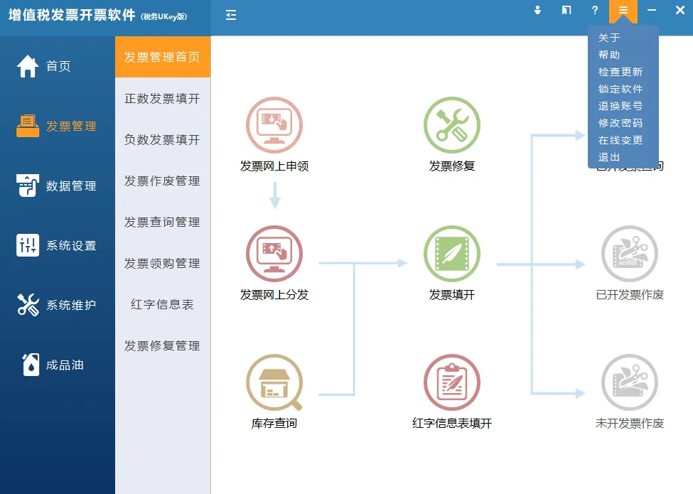 发票申领成功后,点击开票软件的“发票管理”-“发票网上分发”,可将领取的网上发票分发到税务UKey。