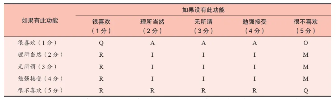 注:M 表示必备型需求,O 表示期望型需求,A 表示魅力型需求,I 表示无差异型需求,R 表示反向型需求,Q 表示可疑结果。