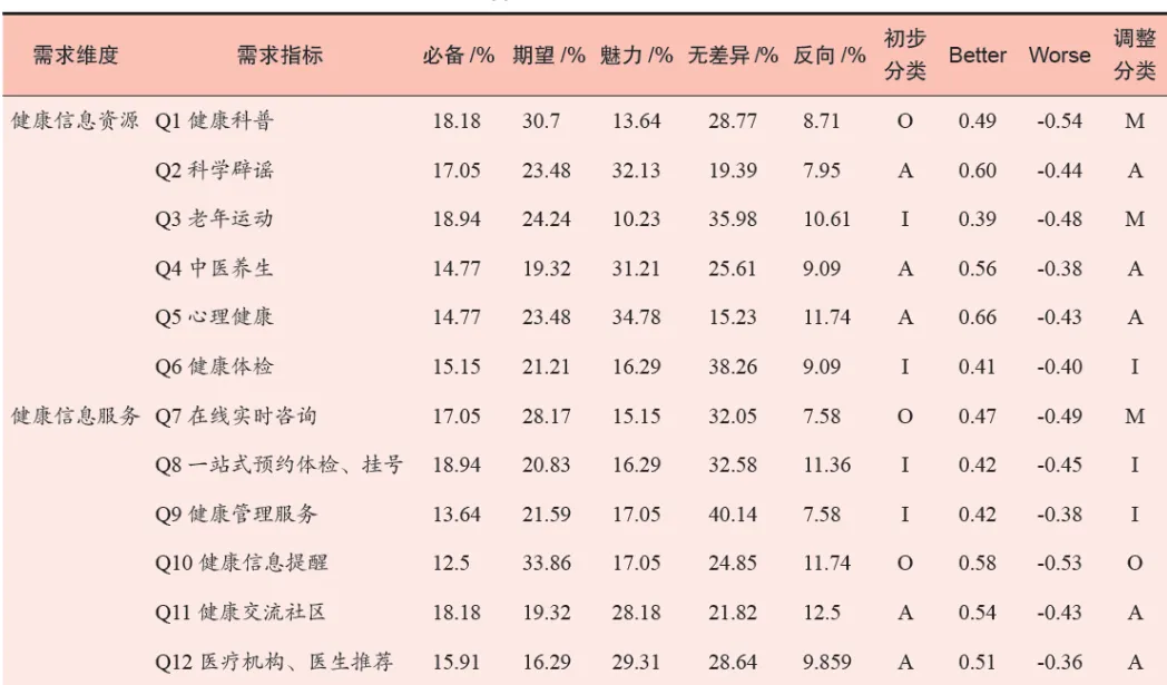 经计算,健康科普、老年运动、在线实时咨询3项需求的Better值较小、Worse绝对值较大,用户对上述需求的关注度更为显著,最终修正为必备型需求。其他需求与初始模型分类相同。