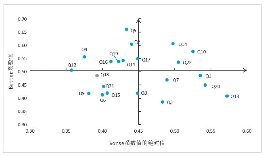 某项需求的Better值越接近1,表示该需求对用户满意度提升的影响效果越大;Worse值越接近-1,表示该需求不满足时对用户满意度造成的负面影响越大。ID值越大则说明该项需求重要度越高,反之越低。