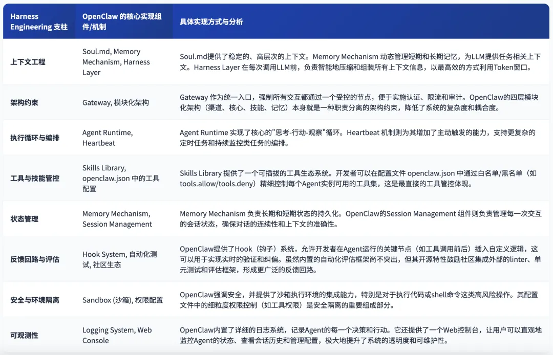 我们可以将第二章中提出的Harness Engineering八大支柱,与第三章中介绍的OpenClaw核心组件进行清晰的映射,从而揭示其内在的实现逻辑。