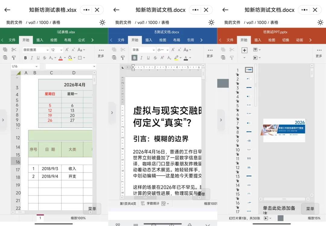 再来看看移动端,Word、Excel、PPT 三种文档都能流畅打开与编辑,但是文档表格这种在手机都是很难受的