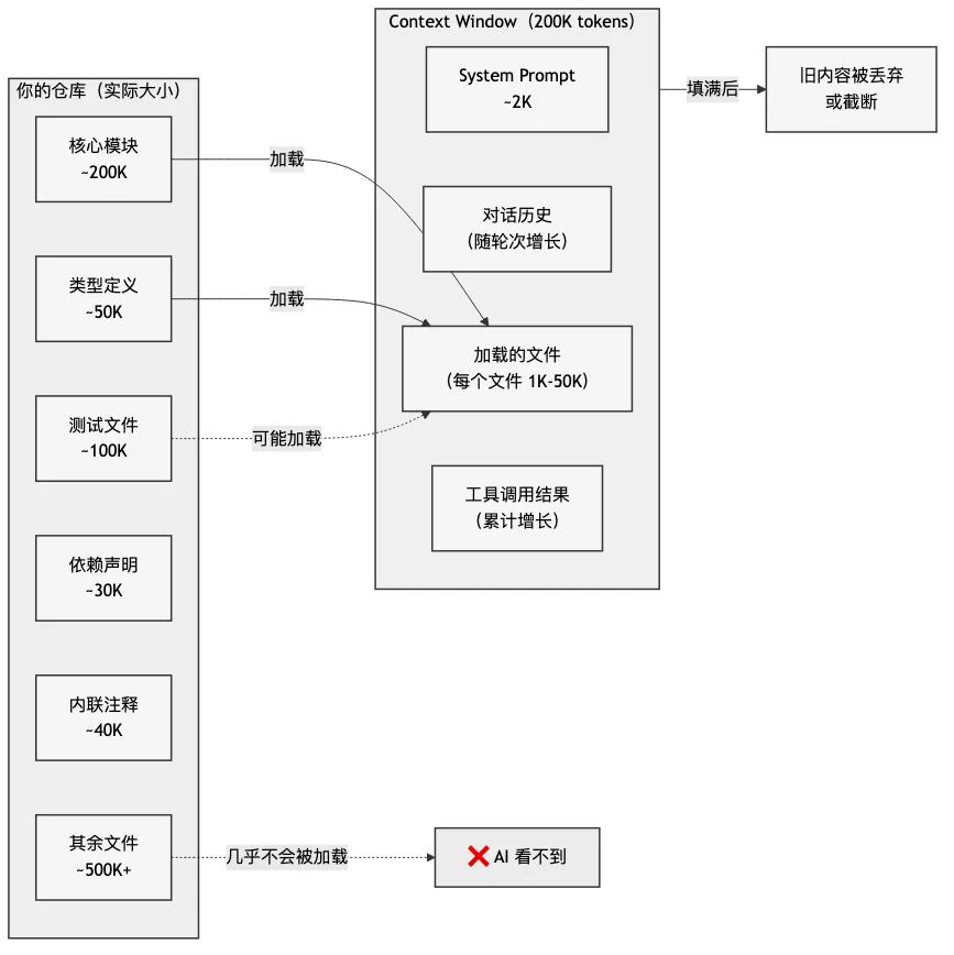 即使是 200K tokens 的大 context window,面对一个真实的中型仓库,能同时装进去的也只是一部分。被装进去的决定了 AI 能看到什么,没被装进去的决定了 AI 会在哪里会犯错——它不知道自己没看到的东西。