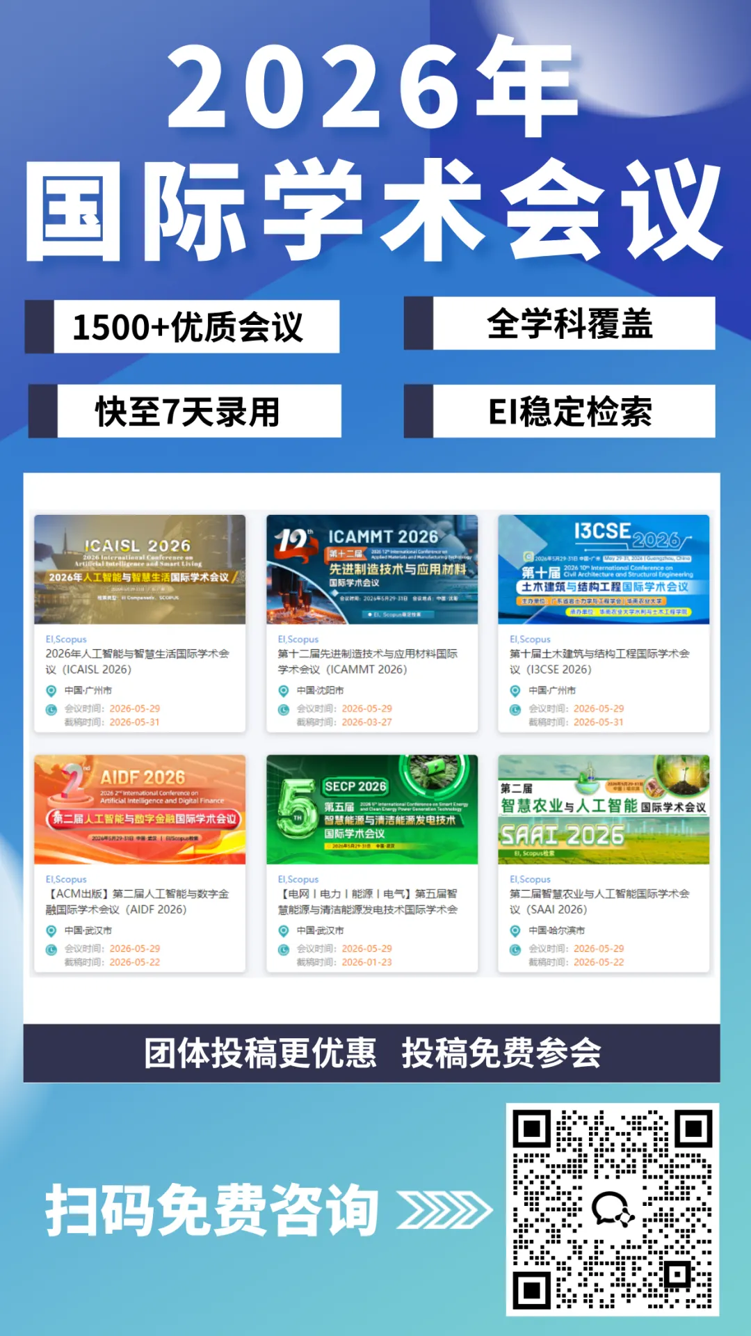 为了帮助各位科研人员能够更高效的完成学术会议参会投稿的准备工作,小编整理了一份学术会议参会投稿加速包~包含【200元学术会议投稿优惠券】、【56份学术交流汇报PPT模板】、【200+学术会议海报Poster模板】,扫描下方二维码添加会议老师直接领取!👇👇👇