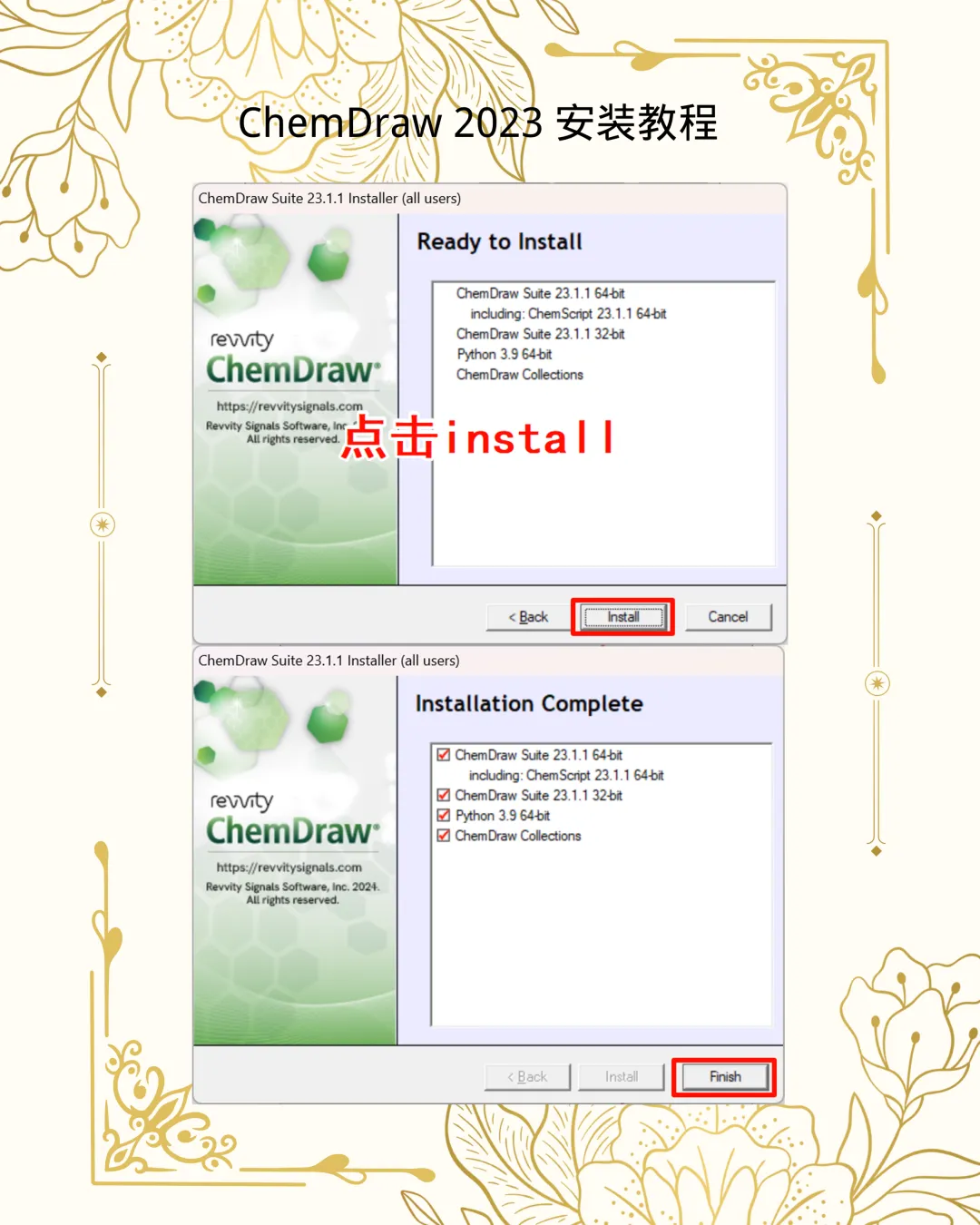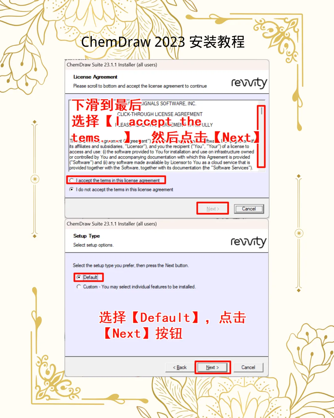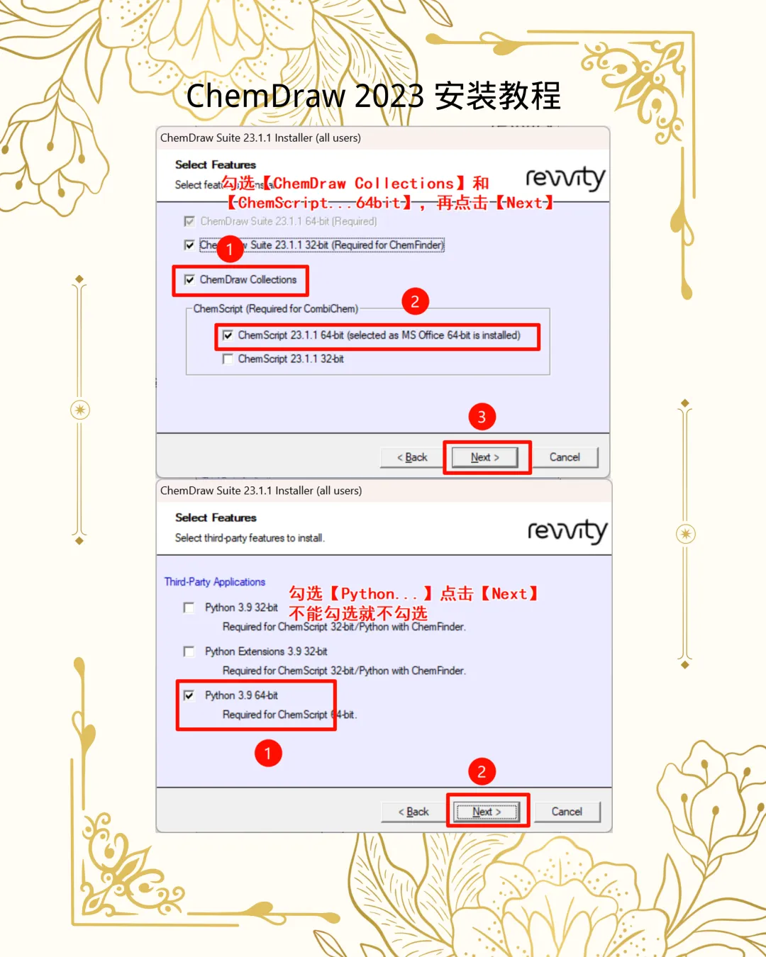 3. 关键组件:在向导中点击 Next,接受协议后务必勾选ChemDraw Collections、ChemScript及Python相关项。