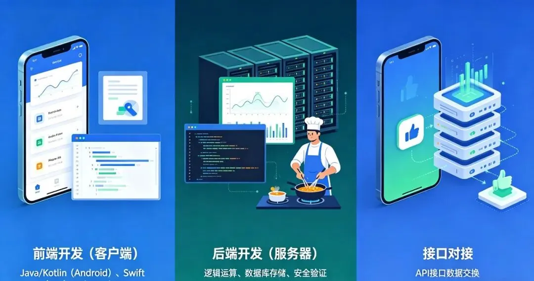 前端开发(客户端): 你能看到、摸到的部分。开发者使用 Java/Kotlin(Android)、Swift(iOS)或跨平台技术(如 Flutter/RN),把设计稿还原成可以交互的界面。