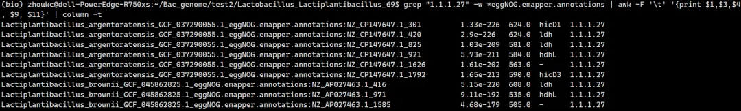 grep "1.1.1.27" -w *eggNOG.emapper.annotations | awk -F '\t''{print $1,$3,$4, $9, $11}' | column -t