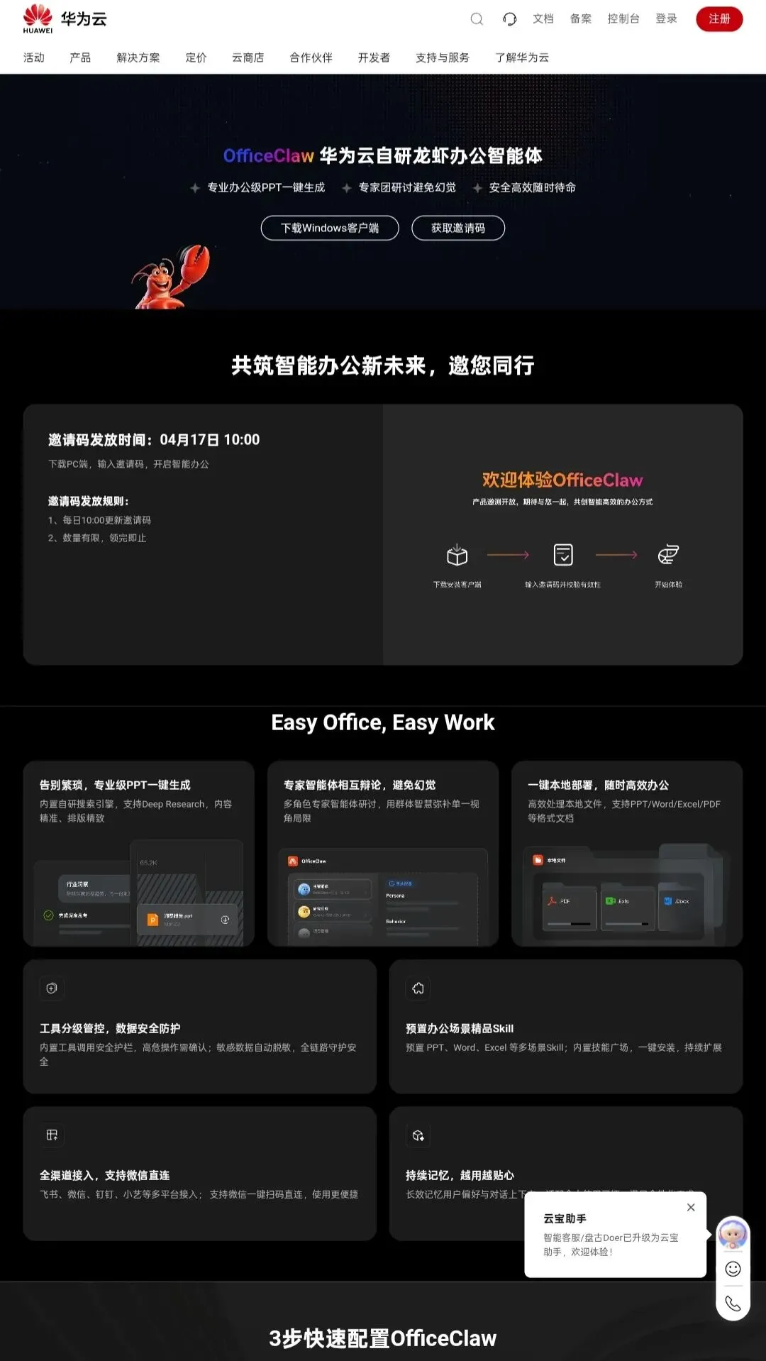 华为云昨日举行 OfficeClaw 办公智能体新品体验会,发布了自研龙虾办公智能体 OfficeClaw,目前发布版本有Windows版,将于今日起每天 上午10 点限量发放邀请码。