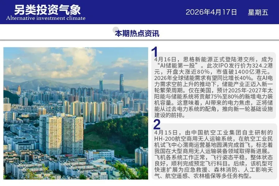 2. 4月16日,思格新能源正式登陆港交所,成为“AI储能第一股”。此次IPO发行价为324.2港元,开盘大涨近80%,市值破1400亿港元。2026年全球储能需求有望同比增长40%。在AI电力需求空前上升的推动下,储能产业正迈入新一轮繁荣周期。仅在美国,预计2025年-2027年太阳能与储能系统将贡献75%至80%的新增电力装机容量。这意味着,AI带来的电力焦虑,正将储能从过去电力系统的配角,推向新一轮基础设施建设的前排。