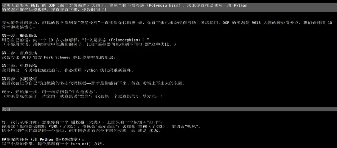 它首先无情地拒绝了妥协:“我直接给你代码模板,你背下来也未必能在考场上灵活运用。” 紧接着,它抛出了强制的四步工作流(概念确认 -> 盲点狙击 -> 引导纠偏 -> 实践验证),并要求学生用 10 岁小孩能听懂的话解释“多态”。