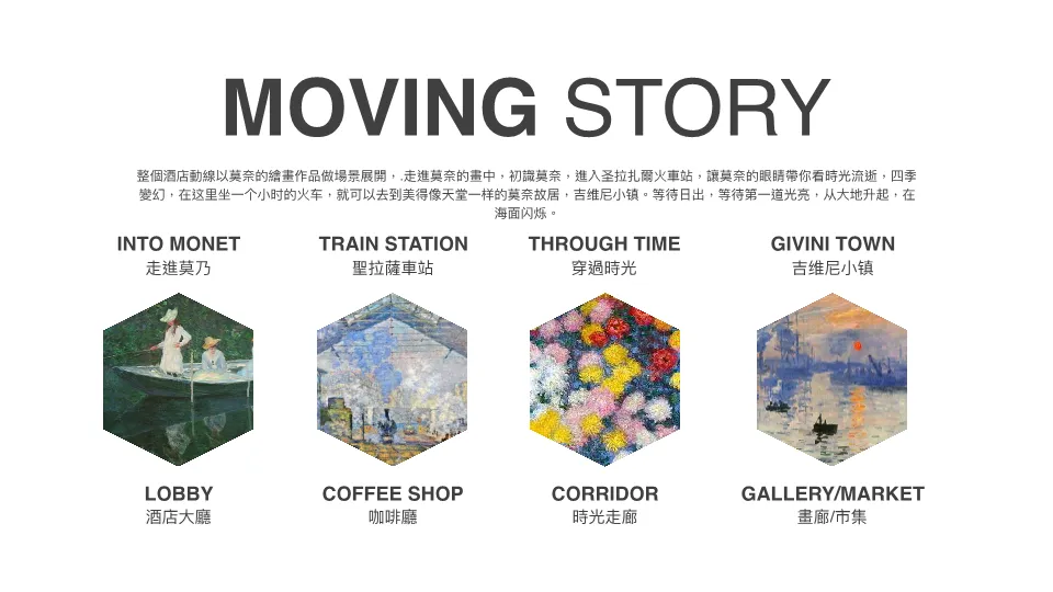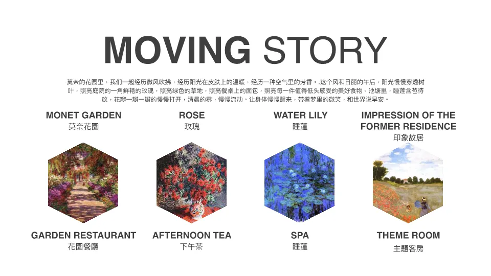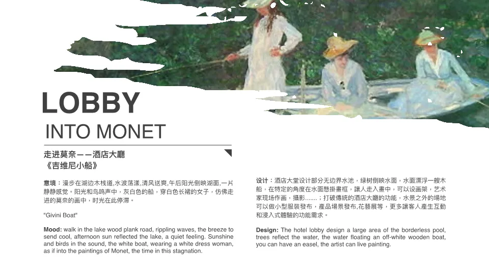本策划案旨在打造一家以法国印象派画家克劳德·莫奈为主题的艺术沉浸式酒店。方案核心在于将莫奈的艺术理念、经典画作与色彩美学,转化为酒店从大堂到客房的全方位空间叙事与感官体验。酒店不仅提供住宿,更是一个融合了画廊、市集、花园餐厅、艺术SPA的多元商业平台。通过策划艺术展览、时尚发布、婚礼派对等活动,并开发艺术衍生品、家居、护肤等系列产品,最终目标是推广一种融合艺术、自然与健康的生活方式,实现品牌文化与商业价值的双重输出。