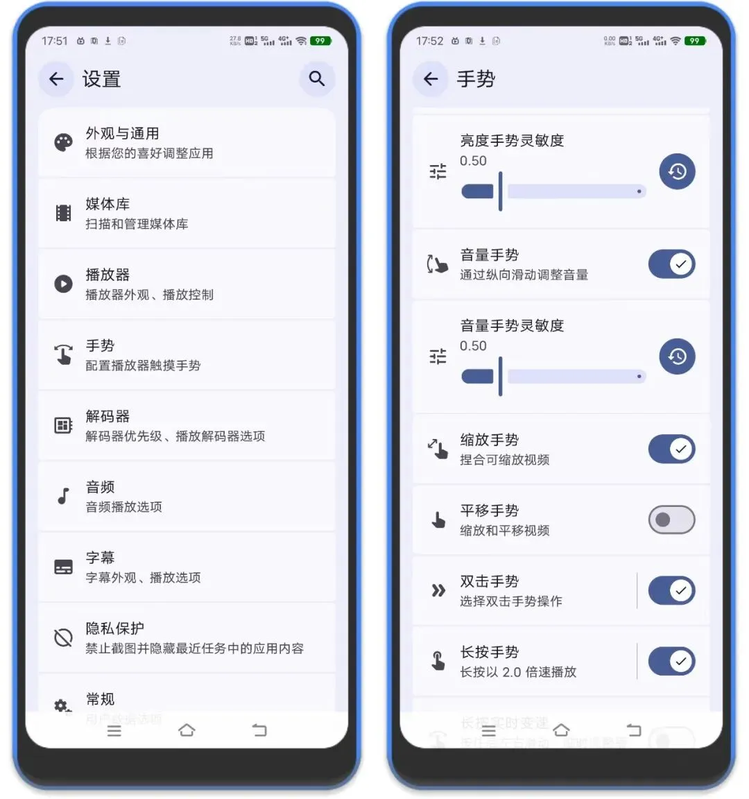 3、在设置里面还有很多丰富的设置,比如全局手势控制:播放界面支持上下左右滑动实现快捷操作,长按2.0倍速播放。外观页面,字幕外观,音频设置等等!