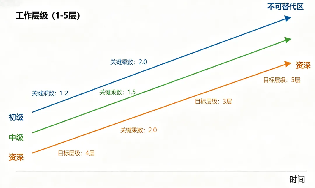 不是靠"更努力地写代码"——那只是在低层级上加班。也不是靠"等晋升"——职级和工作层级是两码事。
