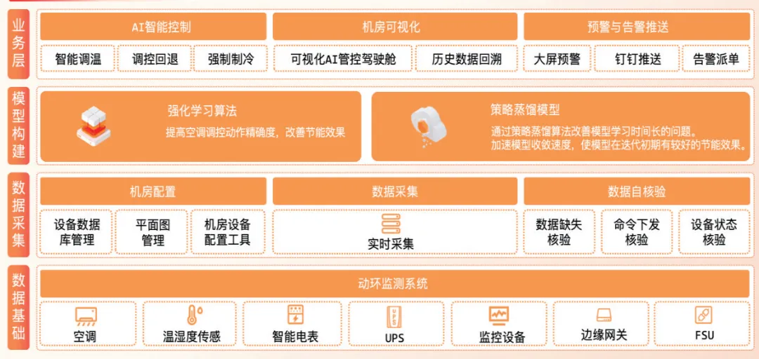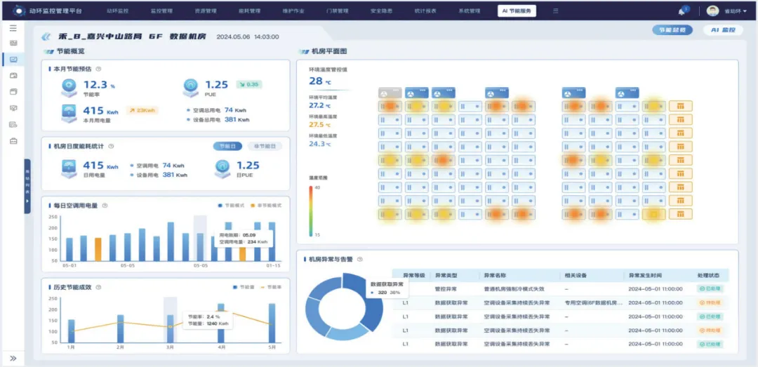 本项目建立AI节能服务规模化应用的标准化流程和系统化工具支撑,提升机房整体安全性和节能收益,打造性能卓越、安全可靠、智能运维的机房节能降耗产品。开展配置与数据质量管理,夯实数智化节能边端设备的基础,构建自动检查、智能识别、敏捷修复的边端处理机制。实现实时监测管控和节能成效核算,全流程跟踪机房部署前、中、后的态势变化,提升过程管理的可视化,并将日志分析、预警信息运用到生产过程中,提升节能运营管理的数字化。