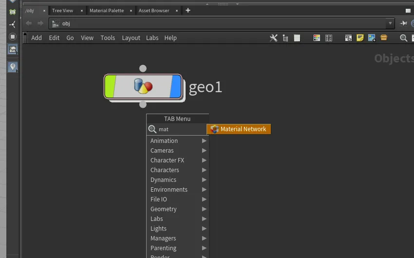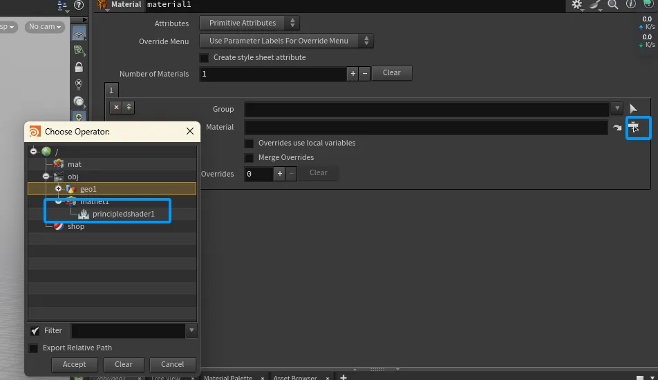 ⏩新建material network节点,点击进入该节点,在里面创建principledshader节点;