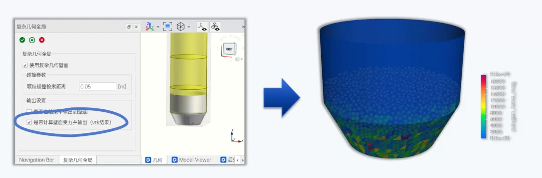 DEMMS 支持自动输出复杂几何的壁面受力情况,适用于探究颗粒流下壁面受到的冲击载荷等