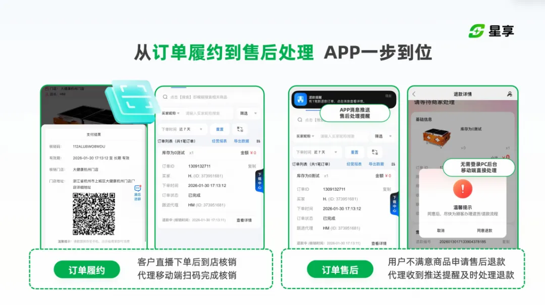 星享直播,为门店场景打造了一站式移动订单处理系统,把核销、库存、订单管理、数据统计等核心功能全部集成到手机上,让你告别电脑束缚,一部手机随时随地处理一切。
