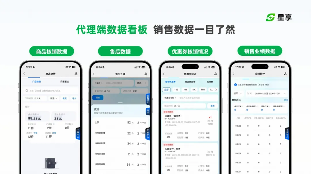 不用再熬夜做报表、算数据,APP内置可视化数据看板,销售业绩、商品核销、售后处理、优惠券核销等核心数据自动统计,按天 / 按周期清晰展示。