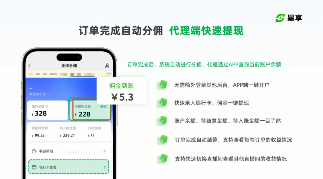 支持 APP 端一键开户,快速绑定银行卡,佣金随时提现,无需额外登录其他后台,告别繁琐对账结算,让每一笔辛苦收益都能快速落袋。