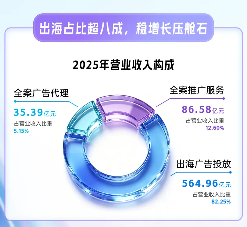 出海2.0:从消费电子到跨境电商,从游戏到短剧,中国企业的全球化浪潮在过去几年里一浪高过一浪,而蓝标抓住了这波红利,成为Meta、Google、TikTokfor Business等平台在中国最大的广告代理伙伴之一。出海业务也成为了蓝标目前业务的顶梁柱,它贡献了蓝标80%以上的营收,是公司当之无愧的基本盘。