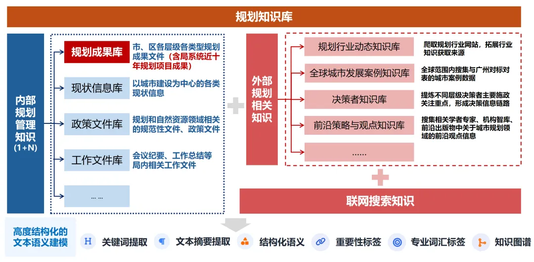 针对局内近十年规划成果等开展数据治理,完成内部知识库构建,同时融合全球城市规划建设案例、专家智库前沿观点等外部规划领域知识,构建多源融合的规划知识库体系。