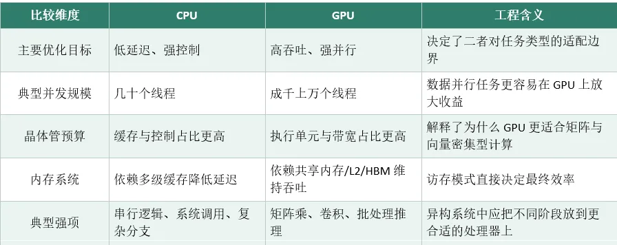 两者不是替代关系,而是明确分工:CPU 负责系统调度、任务编排、复杂控制流;GPU 负责规则统一、数据量大、并行度高的计算任务。