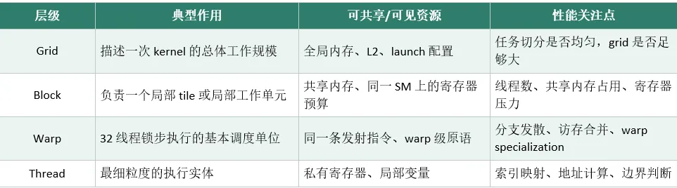 Thread 层:每个线程负责搬运数据、计算地址、维护寄存器里的局部累加片段。