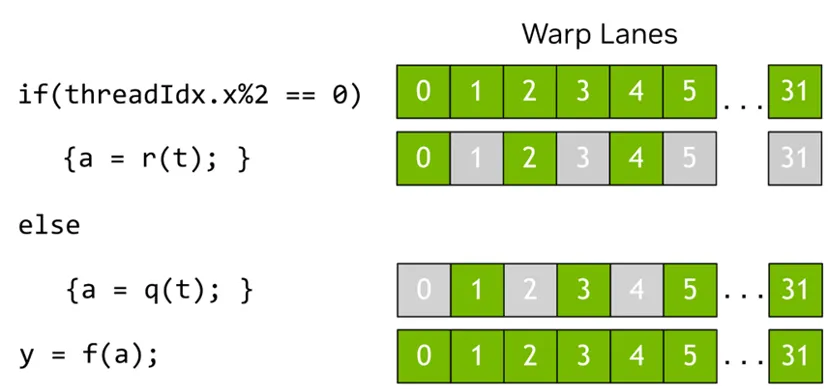 如果同一个 Warp 里的线程进入不同的 if/else 分支,硬件只能分批执行,暂时屏蔽不活跃的线程,导致执行效率大幅下降。