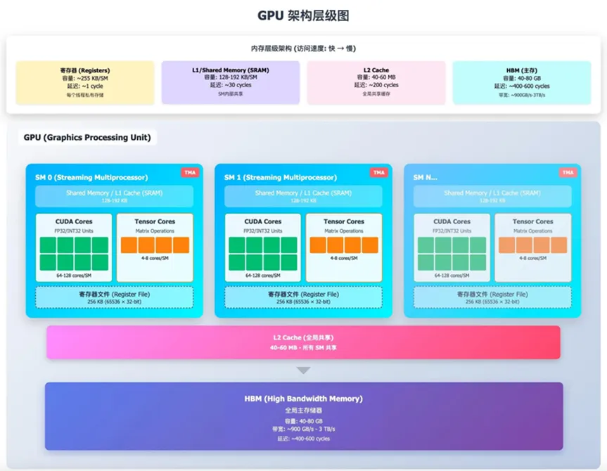 L2 Cache:全 GPU 所有 SM 共享,是全局缓冲,比 L1 慢,但比显存快很多。