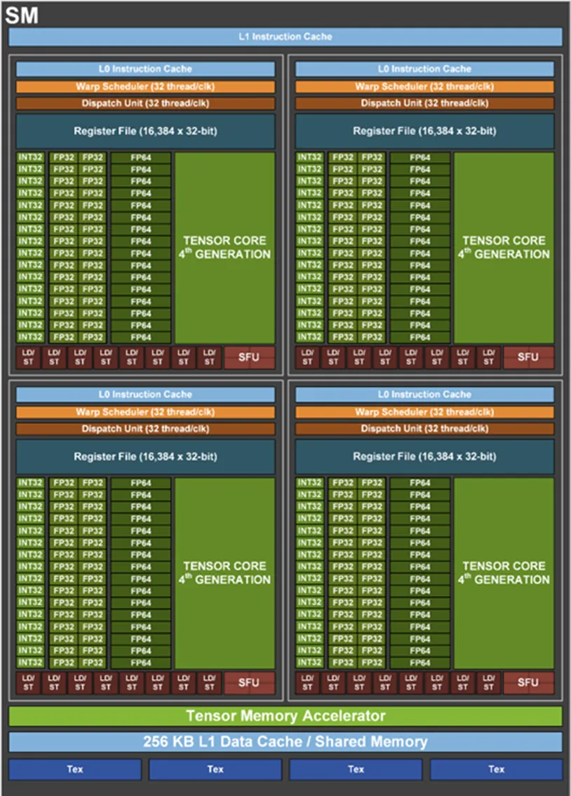 SM 是 GPU 的 “计算核心集群”,可以理解为一个小而完整的并行处理器。一个现代 GPU 包含几十个 SM,它们共同完成所有计算任务。