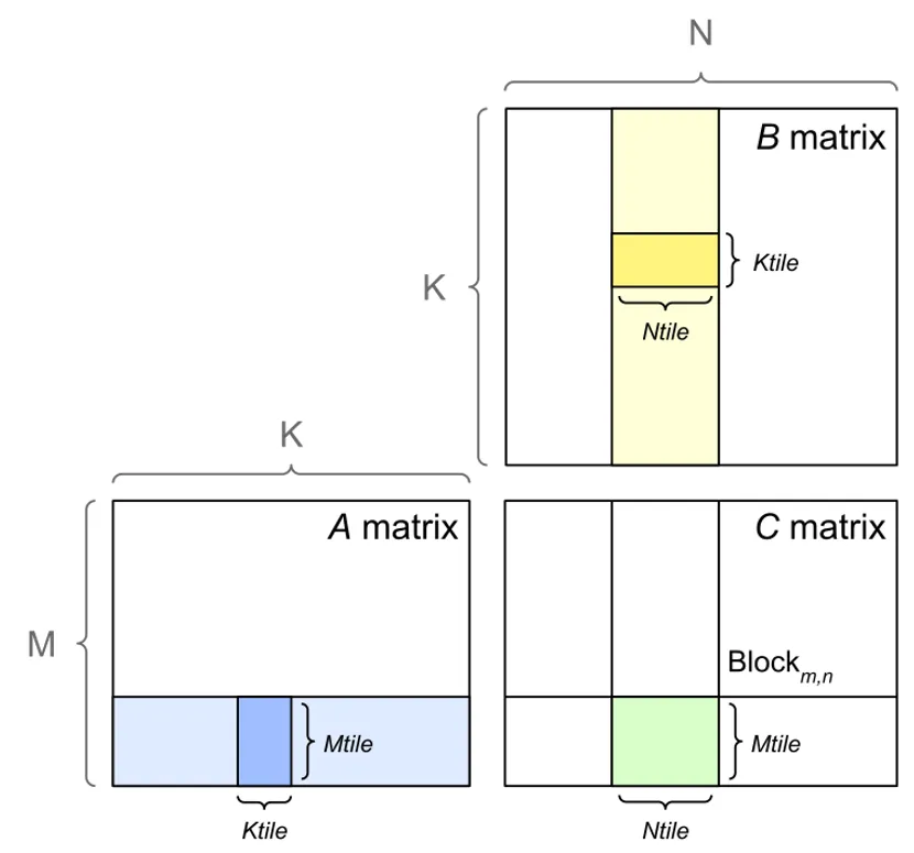 Grid 层:把输出矩阵 C 切分成多个大的 Block Tile(比如 128×128),每个 Block 负责一块输出。