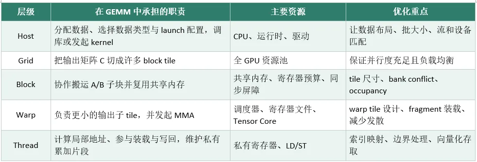 GEMM 的优化不是某一个技巧,而是四层配合、层层落地: