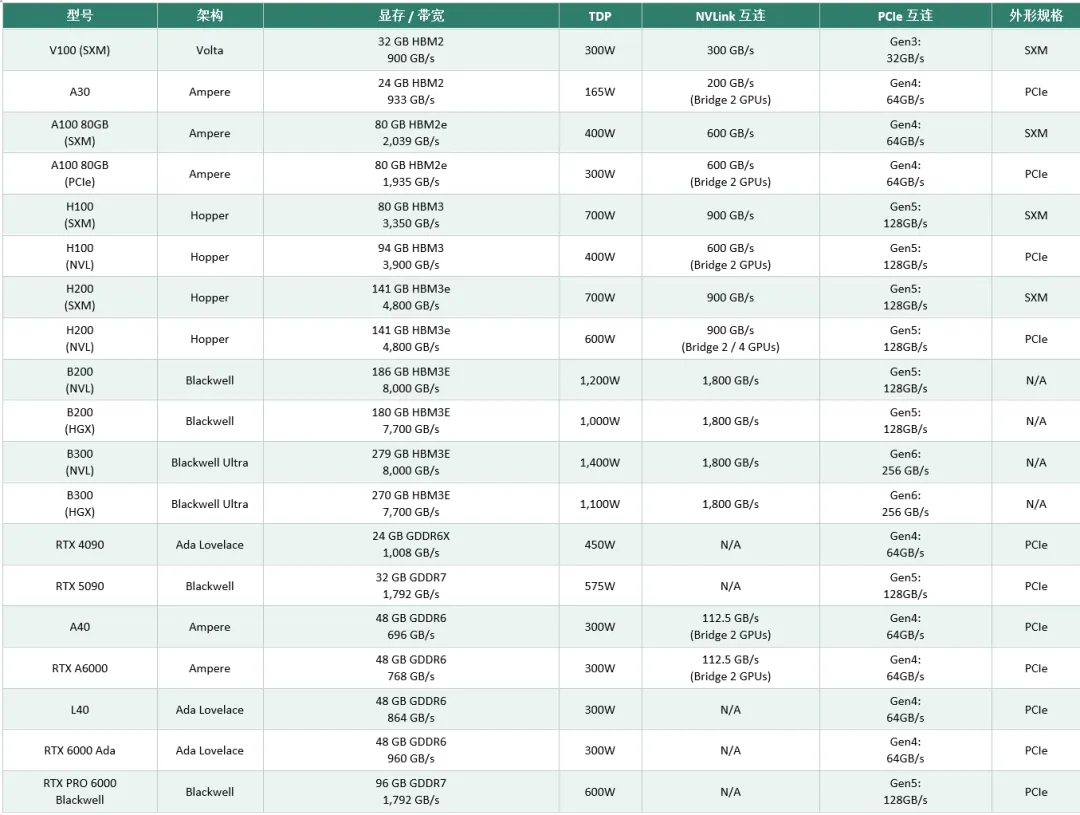 数据中心卡:HBM 高带宽、NVLink 强互连、低精度算力极高,适合大规模训练与推理。