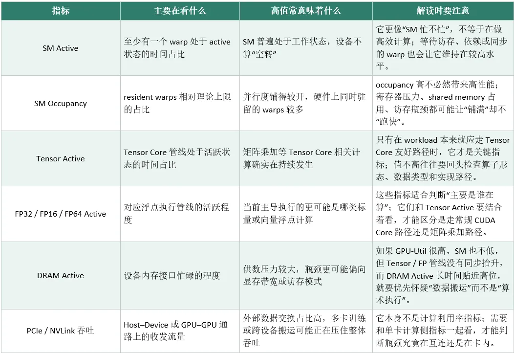 由此可得出简单判断流程:先用 nvidia-smi 看全局状态,再用 DCGM 看 SM、Tensor、DRAM、互连利用率,才能知道卡是 “真的在算”,还是 “假装在忙”。