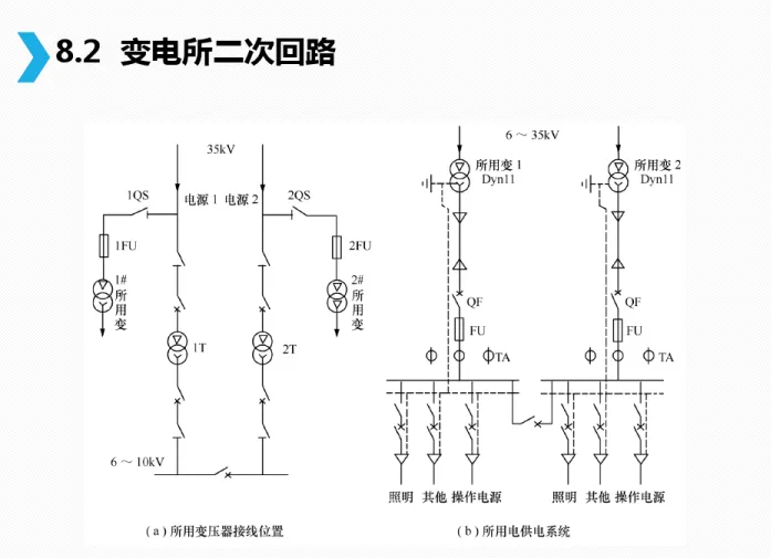 所用电源不仅在正常情况下能保证操作电源的供电,而且在全所停电或所用电源发生故障时,仍能实现对电源进线断路器的操作和事故照明的用电。