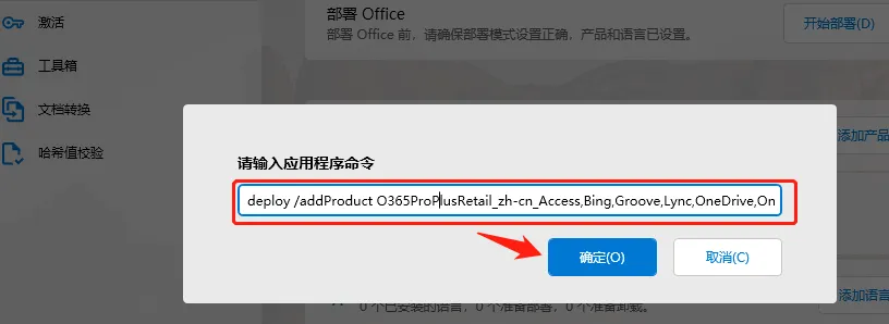 deploy /addProduct O365ProPlusRetail_zh-cn_Access,Bing,Groove,Lync,OneDrive,OneNote,Outlook,Publisher,Teams/addProduct VisioProRetail_zh-cn_Groove,OneDrive/channel Current/downloadFirst
