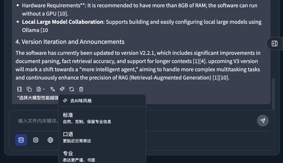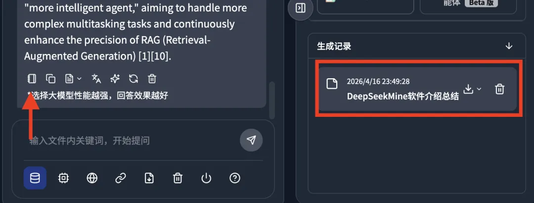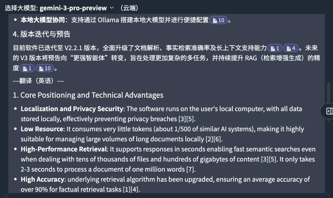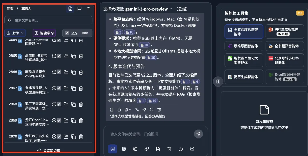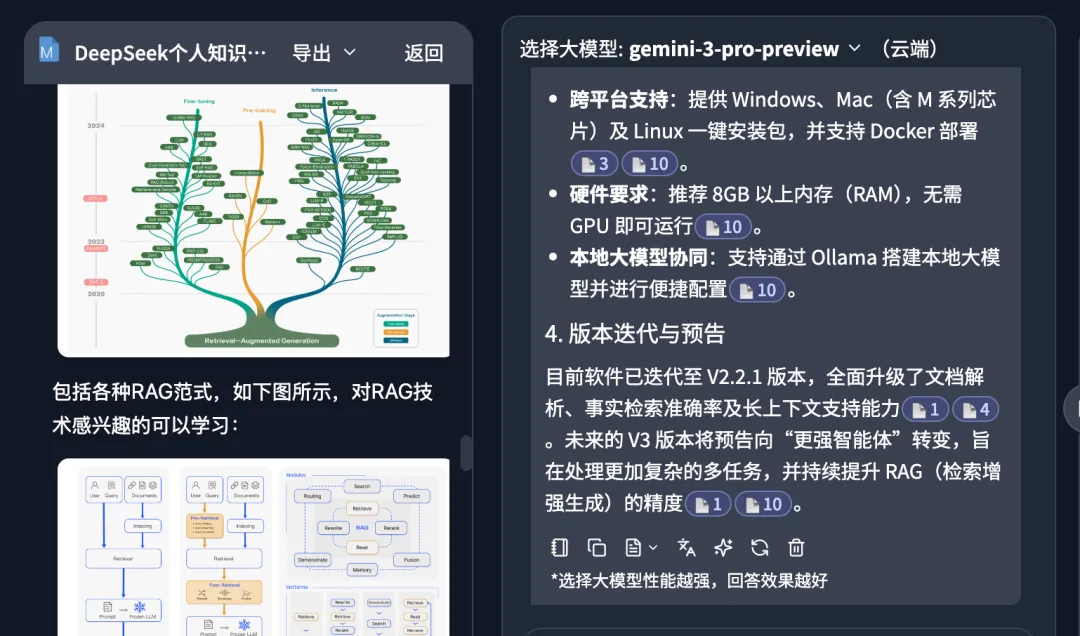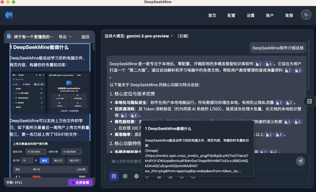 绝了!这个AI一键学完2000个网页,还能自动生成Word总结你好,我是郭震!很多读者有太多资料想让AI去学习了,比如自己电脑里的Word文档,PDF,Excel呀,还有不少朋友几百上千的网页,比如写过的公众号文章,想让AI检索总结、分析等。今天这篇文章分享一种切实可行的方案,感兴趣的读者可以看看,整个过程非常丝滑流畅。1 效果展示我把过去公众号2870篇网页,全部导入到了我们团队研发的DeepSeekMine知识库中:如下图所示2870篇文章全部显示在左侧面板中:点击某一篇文章,看到图文全部都显示出来了:然后提问它:DeepSeekMine介绍总结,它会生成一个完整总结,并带有浅紫色的出处:点击角标,直接定位到指定参考文章的指定段落:清晰明了,一目了然。在这里特别说明,DeepSeekMine软件的算法思想,会从2870篇文章中全部召回,使用关键词+语义向量双路RFC自研算法,拥有很高的检索回答精度。2 方法步骤一共三步,非常简洁。第一步,下载DeepSeekMine软件:https://deepseekmine.com/download我们会不断迭代,定期更新,今天我们又发了新的版本 v2.6.4,这个版本更新最大升级:让本地文件学习速度提升100%,主要通过购买多张显卡,为用户提供更好的文件学习速度。第二步,安装DeepSeekMine,非常简单,基本都是下一步,Windows 和 Mac全部支持,这里不再赘述。第三步,打开软件,新建一个知识库,点击「新建」:然后进入这个卡片(知识库)中,点击「智能学习」:它会自动、批量学习你的文件,文件修改、删除,都会自动同步到DeepSeekMine中,非常方便,然后你就可以基于这些资料,做检索增强总结分析了。3 知识库导出和导入DeepSeekMine提供了非常方便的导入和导出知识库操作,如下图所示,点击想要导出的知识库,支持多个,点击导出知识库即可:导出后你可以方便的分享给你的家人,朋友,同事等,通过下面导入知识库操作:比如,你的1000篇公众号文章可以直接从某台电脑导出,然后直接导入到你的另一台电脑中,非常容易的实现知识库的共享。更多功能另外DeepSeekMine可以直接对AI生成总结做翻译,支持几十种语言:翻译后如下图所示:另外还能对生成的内容,直接去除AI味:还能对AI生成的内容保存为笔记,如右侧所示:还能编辑生成的笔记,并保存:我们正在升级一个新功能,笔记内容自动转存到你的知识库中,然后再让AI学习到你的偏好,让AI越来越懂你。最后总结一下DeepSeekMine让你的海量资料(文档+网页)真正“被AI用起来”,而不是躺在硬盘里吃灰。一键学习、自动同步、精准溯源,让检索和总结变得又快又准。从“资料很多”到“知识随用随取”,这是个人AI知识库的真正价值。软件开发不易,如果你觉得 DeepSeekMine 对你有帮助,也欢迎给我一个三连击:点赞、转发和在看;如果可以,再帮我点一个⭐️。谢谢你看到这里,我们下篇再见。