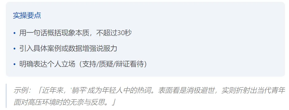 这是即兴评述中最实用的分析框架,适用于绝大多数社会热点话题。四步递进,逻辑清晰,让你在有限时间内构建完整的论述体系。