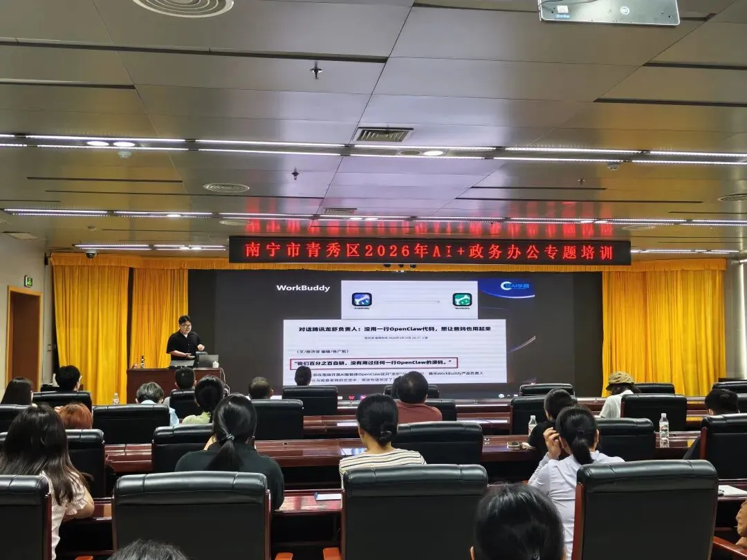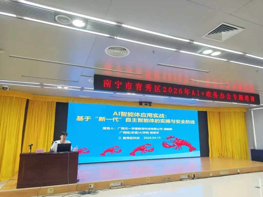 为加速数字化转型,以人工智能赋能政务服务提质增效,4月15日,由南宁市青秀区科学技术协会、青秀区总工会联合主办的AI+政务专题培训顺利开展。广西元一学堂教育科技有限公司携手桂(东盟)AI学院,为青秀区各单位领导班子带来一场前沿、实用的AI智能体实战盛宴,共同探索“新一代自主智能体”OpenClaw(龙虾)在政务办公中的创新应用。