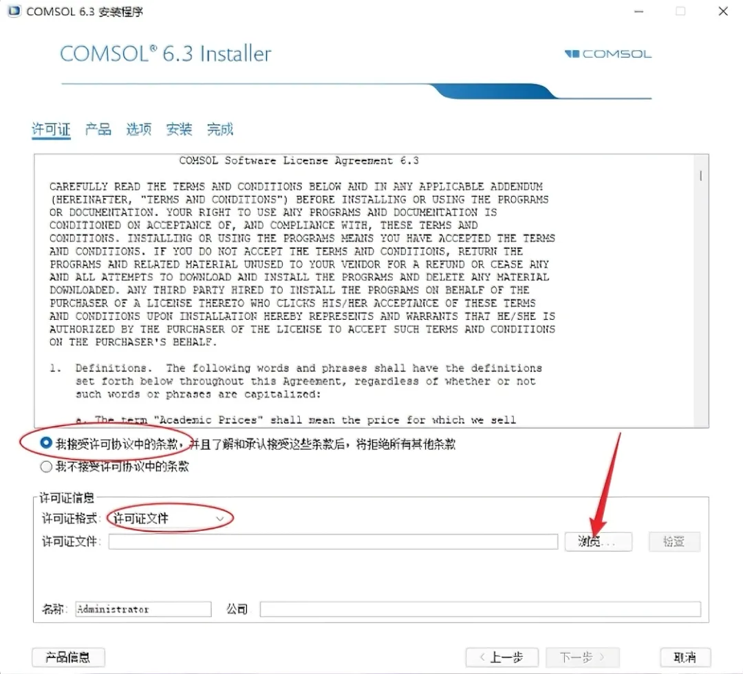 5.添加许可:①选择【我接受许可协议……】②选择许可证格式【许可证文件】③点击【浏览】。
