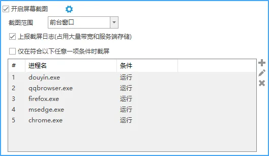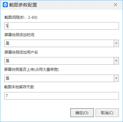 可设置截屏间隔时间、添加快照时间和用户名、保留存储天数、仅在某程序运行时截图。