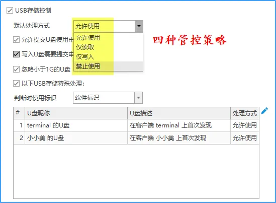 U盘等各种外设也可以批量灵活管理,谁可以用U盘,用哪个U盘,连只读、只写都能指定设置,防止私人U盘滥用,导致文件泄密、病毒传播等危害。