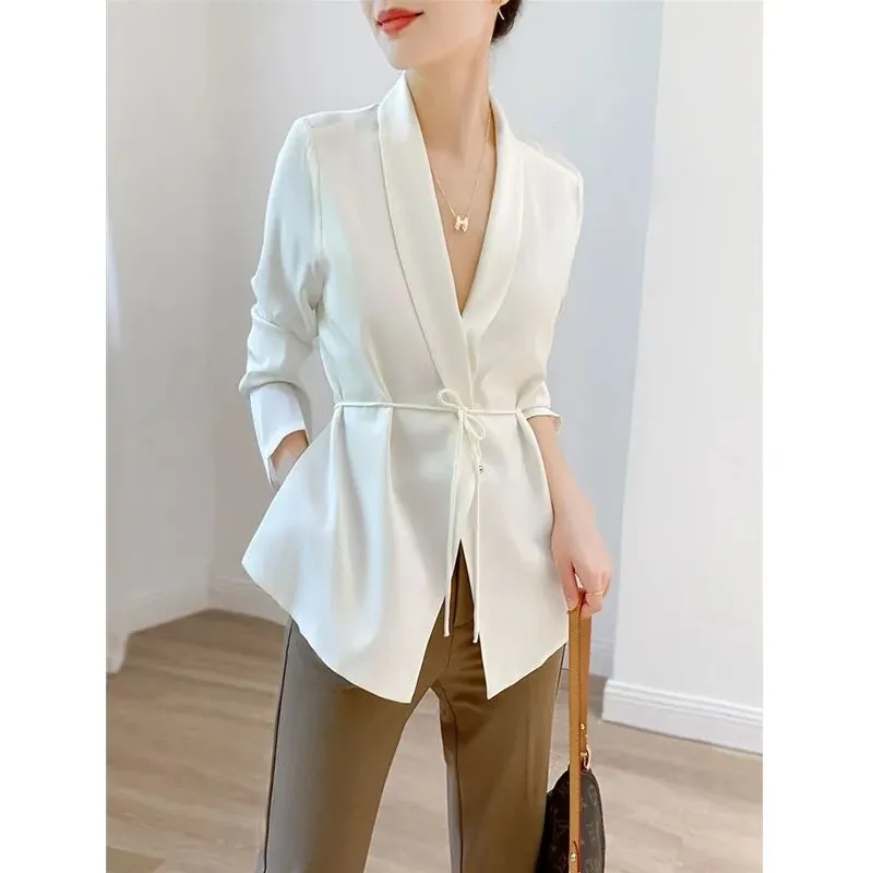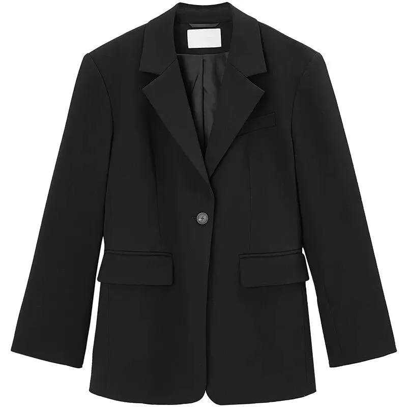 服装:高级通勤西装大衣,H型修身直筒版型,微落肩剪裁,中长款过膝设计,平驳领造型,单排暗扣开合,利落收腰线条,衣身垂坠不臃肿;高支精纺羊毛呢面料,细腻平整,挺括抗皱,软糯有质感,哑光高级肌理,纯色简约配色,细节精致。